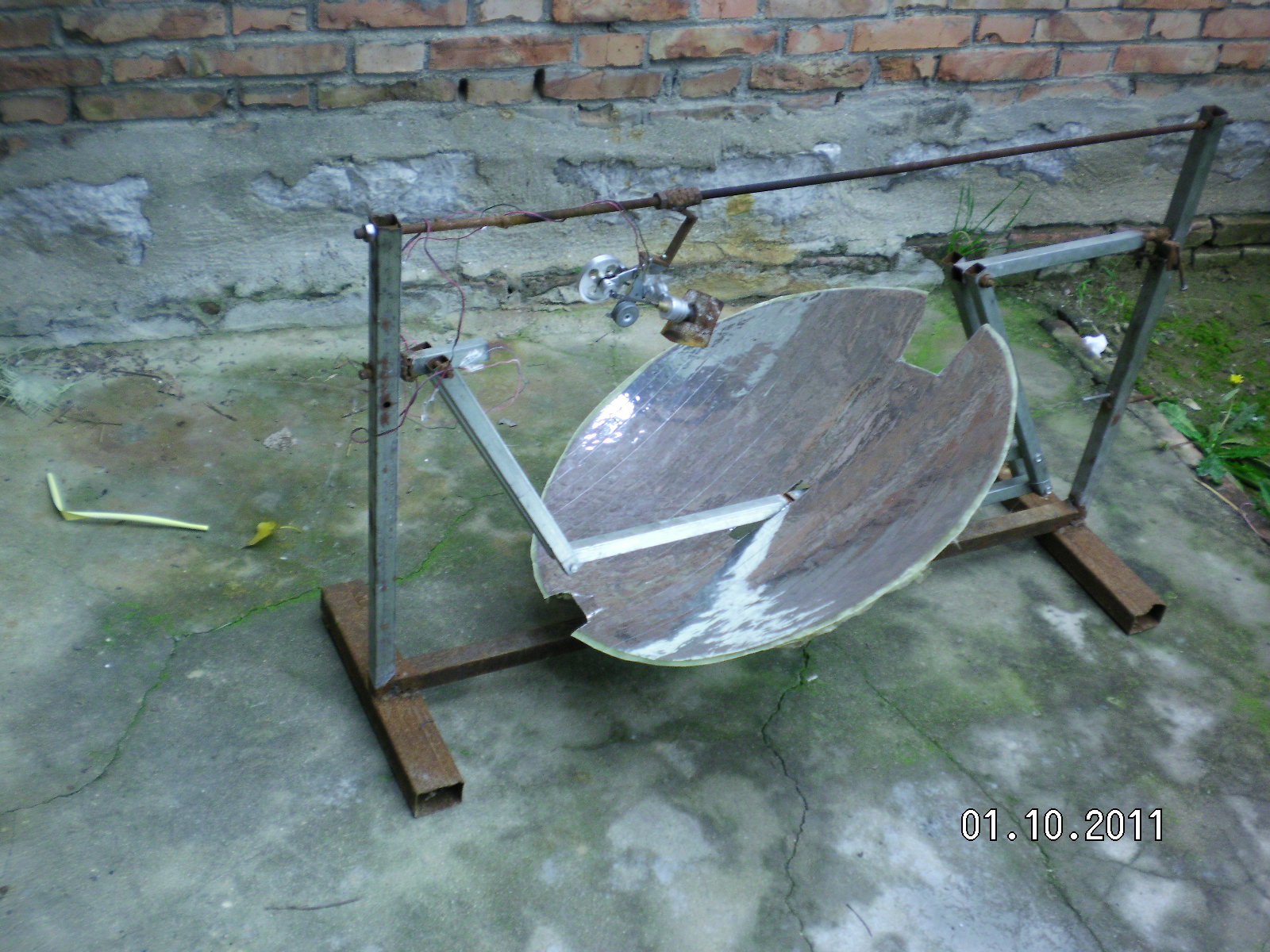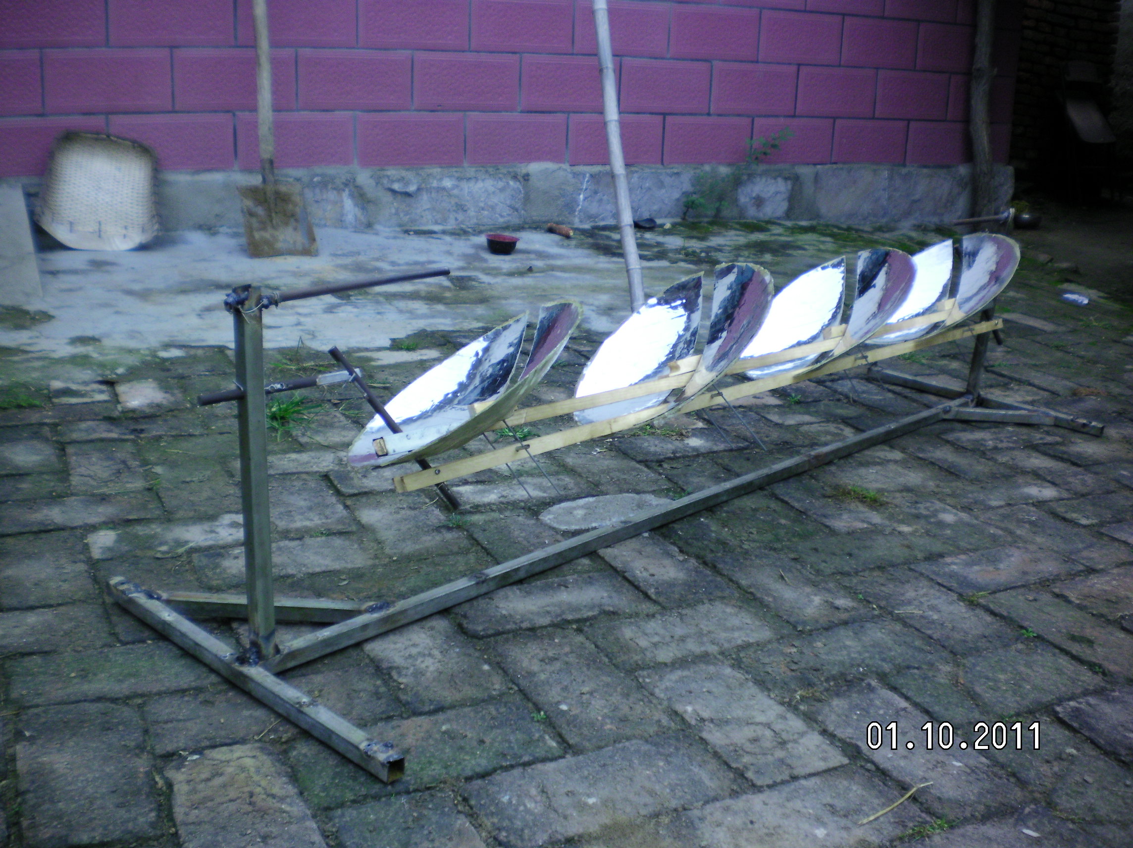 隨著全球環(huán)境惡化和日益嚴峻的能源形勢世界各國對太陽能熱發(fā)電越來越重視。現在最常用的太陽能熱發(fā)電系統(tǒng)主要有槽式、蝶式和塔式,槽式和蝶式的光熱部件必須隨聚光鏡做相應的運動,槽式各個光熱部件復雜昂貴,蝶式光熱部分只能單獨使用塔式的受熱部分出現故障很難維修這三種系統(tǒng)都有自己的缺點?;诖宋以O計了平行定焦太陽能聚光集熱發(fā)電系統(tǒng):主要有一對支柱.一對轉軸.一對動臂.旋轉拋物面聚光鏡.一根托桿.一根平行桿.平行連桿組成將兩支柱固定在一條直線上,兩轉軸安裝在兩支柱上兩轉軸可以左右轉動,兩動臂安裝在兩轉軸上使可以隨轉軸左右前后擺動。托桿安裝在兩動臂上,平行桿與托桿平行安裝在兩動臂上,這樣動臂.托桿.平行桿構成一個平行凹框。在旋轉拋物面鏡原點安一橫軸并切去部分旋轉拋物面鏡,在橫軸兩端垂直安裝兩根平行連桿,把旋轉拋物面鏡的橫軸安裝在托桿上。在平行桿上安裝連桿軸把平行連桿與連桿軸連接在一起。所述旋轉拋物面鏡的焦距等于托桿與轉軸之間動臂的長度。將動臂對準太陽陽光就會聚焦到固定點上在這些位置安裝光熱部件就會得到熱能用于熱發(fā)電。這種結構是雙軸定焦所以效率很高,抗風性好。這種結構可以做成很小裝在高在15-20cm的透明罩內安裝在樓頂或樓房南墻上,為人們提供開水或蒸汽。請看模型照片: