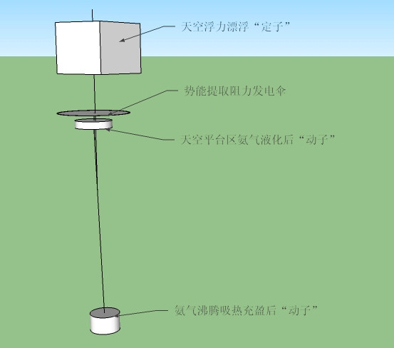 如上圖所示:設(shè)計(jì)一種系統(tǒng),在地面的時(shí)候“動(dòng)子”里面的物質(zhì)呈氣態(tài),而且單位體積明顯輕于空氣,就會(huì)形成比較大的浮力,使“動(dòng)子”具有上升的趨勢(shì),放開“動(dòng)子”任其在浮力下,自由上升,當(dāng)上升到一定高度后,“動(dòng)子”內(nèi)的氣體由于溫度明顯下降而液化成液體,這時(shí)浮力消失,“動(dòng)子”在重力作用下會(huì)快速下落。這就形成了一個(gè)利用熱能、勢(shì)能、動(dòng)能之間相互轉(zhuǎn)化而形成的一個(gè)“永動(dòng)系統(tǒng)”而且能從外界獲取可觀能源來發(fā)電。只要做出“動(dòng)子”上升時(shí)保溫,上升到一定高度后能自由撤銷保溫狀態(tài)進(jìn)行熱交換就可以了。