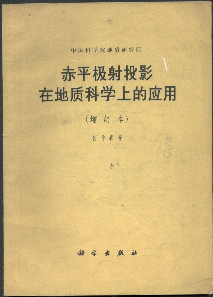 “極射赤平投影”不僅是研究巖組學(xué)的重要工具,而且也是地質(zhì)構(gòu)造研究方面的方法典范,在地質(zhì)學(xué)上廣泛應(yīng)用。何作霖是我國(guó)第一個(gè)對(duì)該方法在地質(zhì)科學(xué)上應(yīng)用做綜合闡述者。他集多年的理論研究、科研實(shí)踐及各國(guó)零散資料撰寫(xiě)出版了《赤平極射投影在地質(zhì)科學(xué)中的應(yīng)用》(科學(xué)出版社,1958)一書(shū),深受巖礦工作者喜歡,后又多次再版。這是世界上第一部這方面的專著,也是中國(guó)構(gòu)造地質(zhì)學(xué)和巖石礦物學(xué)工作者長(zhǎng)期必讀的重要工具書(shū)。