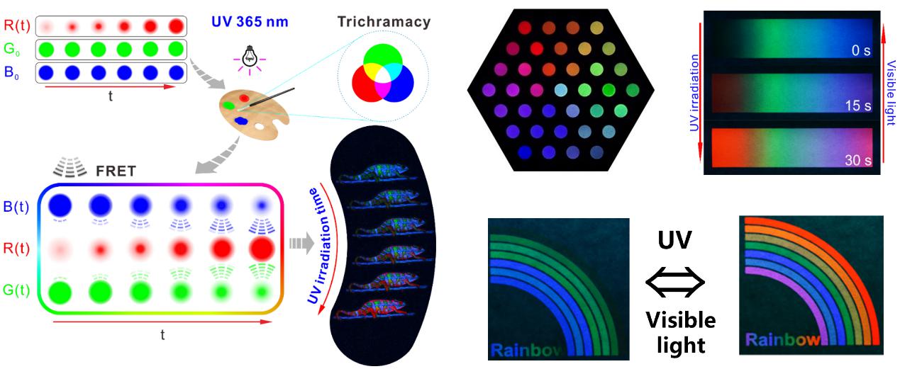 比如發(fā)光的防偽材料,利用纖維素均相可控反應(yīng)的優(yōu)勢(shì),把原來(lái)容易聚在一起的熒光分子,通過(guò)化學(xué)方法鍵合到纖維素上,克服了溶液狀態(tài)下聚集誘導(dǎo)淬滅效應(yīng),將其制成固態(tài)熒光材料,同時(shí)它仍然具有高分子的可打印、可噴涂的特點(diǎn),將不同的發(fā)光基團(tuán)接到不同的纖維素上可以得到不同的顏色,將紅、綠和藍(lán)三種顏色的纖維素衍生物共混,利用三基色原理,還可以做打印的動(dòng)態(tài)熒光材料(圖5)。