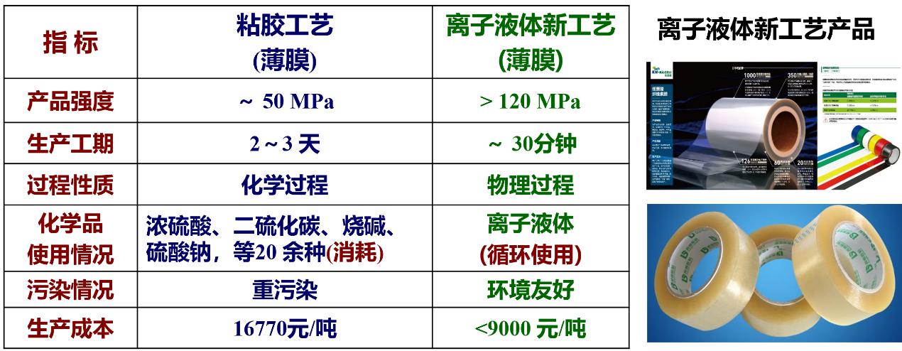 以前纖維素制膜工藝污染很大,中國(guó)逐漸在關(guān)停。而我們的離子液體工藝是物理溶解,基本沒(méi)有污染。原來(lái)工藝需要三天時(shí)間,現(xiàn)在三十分鐘就做出來(lái)了(圖8)。在車(chē)間里面都聞不到氣味,火都點(diǎn)不著,非常安全。其中溶劑是我們的專利,包括后面的溶劑回收,溶劑是可以回收再反復(fù)利用的。用我們這個(gè)工藝與企業(yè)合作建立了生產(chǎn)線,2019年基本已經(jīng)建成了,今年11月底試車(chē)。生產(chǎn)的產(chǎn)品推薦在快遞物流上使用,特別是用低成本秸稈做的膠帶,有很好的應(yīng)用前景。