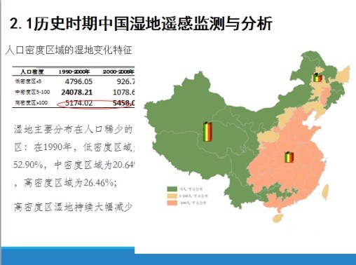 如圖,人口密度與區(qū)域濕地變化特征,過(guò)去30年期間每個(gè)時(shí)間段里都是減少速度最快的,人口比較少的區(qū),小于5個(gè)人的區(qū)間就比較少。濕地主要分布在人口稀少的地區(qū):在1990年,低密度區(qū)域?yàn)?2.90%,中密度區(qū)域?yàn)?0.64%,高密度區(qū)域?yàn)?6.46%;高密度區(qū)濕地持續(xù)大幅減少。
