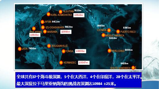 全球海洋深度大于6000米的區(qū)域只有1%左右,而海斗深淵卻有37個,有5個在大西洋、4個在印度洋、其它的在太平洋。