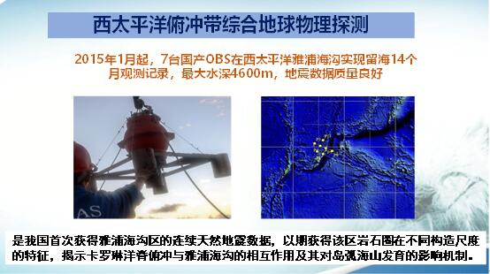 在2015年,我國在西太平洋雅浦海溝投放了7臺海底地震儀,留海觀測時間是14個月,最大的水深是4600米。記錄的地震波形都很好。主要用于揭示巖石圈在不同構(gòu)造尺度的特征,了解卡羅琳洋脊俯沖與雅浦海溝的相互作用及對島弧海山發(fā)育的影響機制。