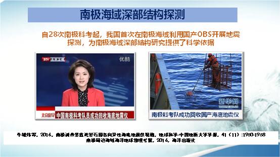 在南極地區(qū),我國有二處陸上地震臺站。在第28次南極科考時投放了海底地震儀,過了一年,在第29次南極科考船去那片海域回收時,因那片海域結(jié)冰,沒法回收。根據(jù)設(shè)計,海底地震儀最大留海時間為一年,大家都擔(dān)心失掉這兩臺儀器了??上驳氖?,又過了一年那片海域已經(jīng)沒有冰了,在回收時,海底地震儀竟然浮到海面,這是在海底記錄時間最長的一次試驗。也為南極海域深部結(jié)構(gòu)研究提供了科學(xué)依據(jù)。