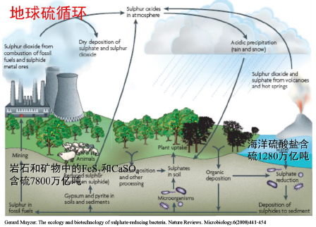硫磺是重要化工原料,我國是硫磺消耗大國也是進(jìn)口大國,2017年我國硫磺進(jìn)口達(dá)1123.6萬噸,產(chǎn)量590萬噸。硫循環(huán)是地球三大物質(zhì)循環(huán)之一,硫各種價(jià)態(tài)間轉(zhuǎn)化的實(shí)現(xiàn)均由硫細(xì)菌來完成(圖1-1)。