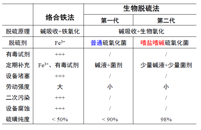 經(jīng)過中試連續(xù)運(yùn)行我們發(fā)現(xiàn)嗜鹽嗜堿硫氧化脫硫體系相比傳統(tǒng)絡(luò)合鐵法具有明顯的優(yōu)勢:極端微生物可耐受的環(huán)境優(yōu)勢更為突出,僅需定期補(bǔ)充堿液及少量菌劑就可保證整個(gè)系統(tǒng)連續(xù)運(yùn)轉(zhuǎn),勞動(dòng)強(qiáng)度小,且系統(tǒng)回收單質(zhì)硫磺的純度高達(dá)98%。更多內(nèi)容見下表。