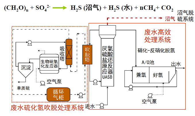 在高硫酸鹽廢水處理集成系統(tǒng)中,首先硫化氫先經(jīng)過吹脫處理,降低硫化氫對(duì)后續(xù)反應(yīng)中對(duì)厭氧反應(yīng)的抑制。經(jīng)吹脫過的廢水進(jìn)入?yún)捬趿蛩猁}還原反應(yīng)器,進(jìn)行一系列后續(xù)高效的硝化與反硝化處理,最終出水達(dá)標(biāo)排放(圖1-9)。