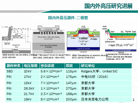 雖然在低壓領(lǐng)域SiC已經(jīng)進(jìn)入產(chǎn)業(yè)。但是在高壓領(lǐng)域,不管是國內(nèi)還是國外都還處于研發(fā)階段。由于材料的優(yōu)勢,國外的研發(fā)進(jìn)度要領(lǐng)先一些,日本京都大學(xué)在3年前就研發(fā)了26.5kV的PiN二極管,美國的Cree公司在也在3年前就研發(fā)了20.7kV的IGBT。國內(nèi)在引進(jìn)先進(jìn)的厚膜外延設(shè)備后,厚膜外延材料制備技術(shù)得到進(jìn)步,最近也在高壓器件方面做了一些成績,比如中電55所在2016年報道了17kV 的PiN二極管,在2018年報道了12kV 的IGBT,說明國內(nèi)材料在一步步進(jìn)度,器件的差距也和國外漸漸縮小。