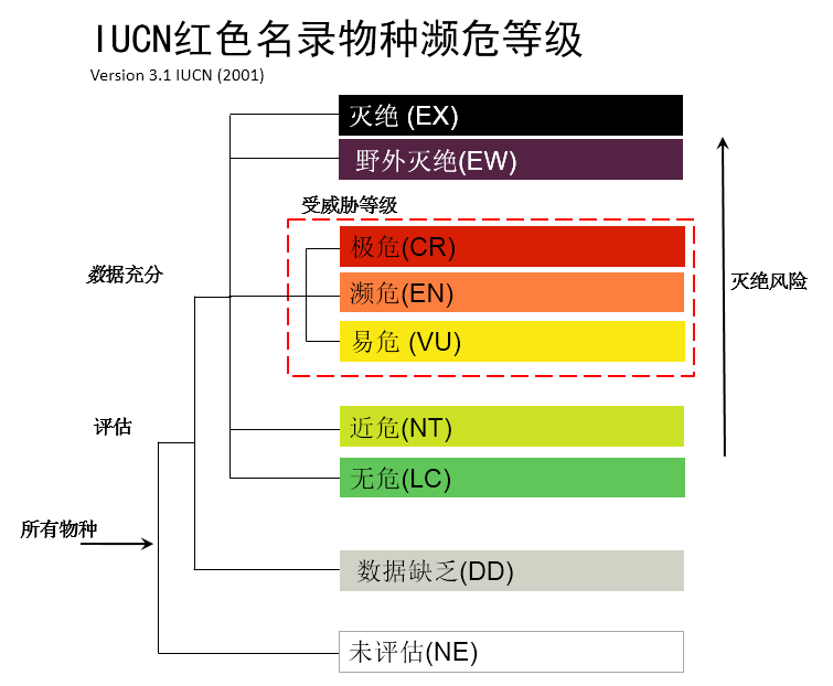 IUCN自20世紀(jì)60年代成立之日起,就設(shè)立了物種生存委員會(huì)(SSC),開(kāi)始編制和印刷《IUCN瀕危物種紅皮書(shū)》,后來(lái)隨著評(píng)估物種的增加,印刷版逐步發(fā)展為網(wǎng)絡(luò)版的《IUCN瀕危物種紅色名錄》,定期編制發(fā)布。IUCN/SSC研究制定了《IUCN物種紅色名錄瀕危等級(jí)和標(biāo)準(zhǔn)》,根據(jù)物種的種群數(shù)量和分布情況等,評(píng)估其生存狀況,確定其瀕危等級(jí)。IUCN瀕危物種等級(jí)標(biāo)準(zhǔn)分為“有評(píng)估數(shù)據(jù)”和“數(shù)據(jù)缺乏”兩類(lèi),“有數(shù)據(jù)評(píng)估”中又分為“滅絕”、“野外滅絕”、“區(qū)域滅絕”、“極危”、“瀕?!薄ⅰ耙孜!?、“近危”和“無(wú)?!钡?個(gè)級(jí)別,從“無(wú)危”到“極?!保瑴缃^風(fēng)險(xiǎn)逐步上升,瀕危等級(jí)逐步增加。瀕危等級(jí)標(biāo)準(zhǔn)有5個(gè)指標(biāo),分別是種群下降、有限地理分布區(qū)、下降小種群、非常小或非常有限的種群、以及模型模擬等量化分析,根據(jù)這些指標(biāo)的數(shù)量閾值,來(lái)評(píng)估物種的瀕危等級(jí)。