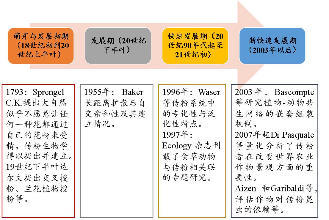 由于傳粉昆蟲的重要性以及目前所面臨的危機(jī)已經(jīng)引起科學(xué)家和民眾的廣泛關(guān)注。諸多地區(qū)級、國家級乃至全球級別的傳粉研究已經(jīng)取得了階段性的成果。就全球范圍來說,傳粉昆蟲的研究主要包括四個(gè)時(shí)期,分別為:1)萌芽與發(fā)展初期(18世紀(jì)初到20世紀(jì)上半葉);2)發(fā)展期(20世紀(jì)下半葉);3)快速發(fā)展期(20世紀(jì)90年代起至21世紀(jì)初);4)新快速發(fā)展期(2003年以后)。