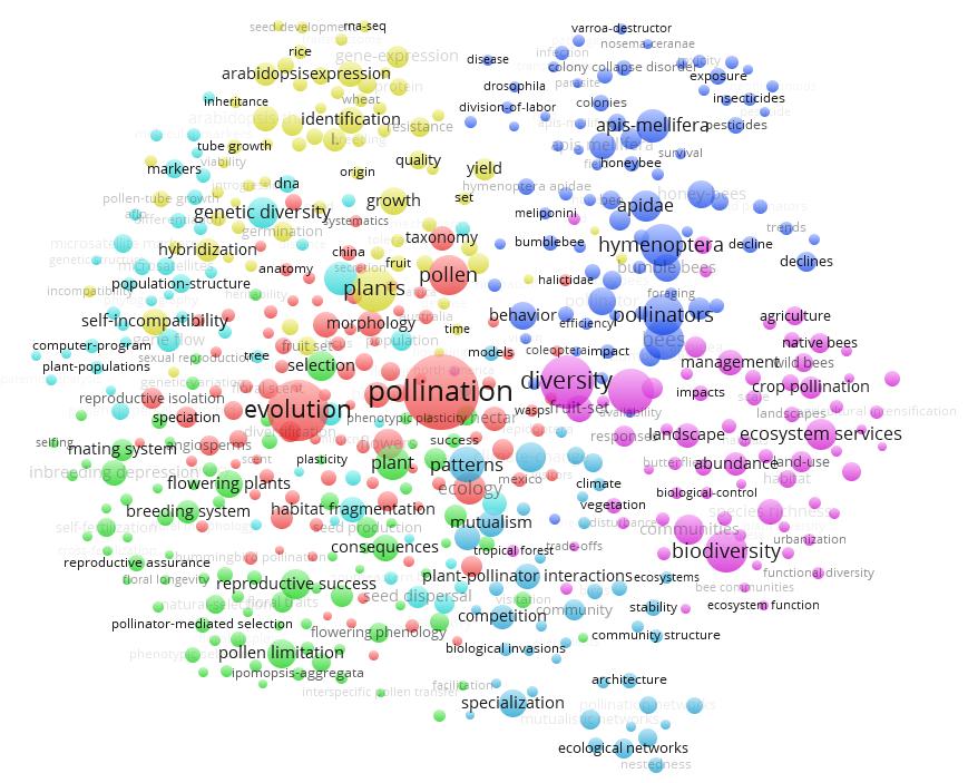 與此同時(shí)我們還通過ESI對pollination和pollinator等關(guān)鍵詞進(jìn)行檢索,可以大致得出傳粉昆蟲研究領(lǐng)域的現(xiàn)有研究前沿如下:1)常用新煙堿類殺蟲劑對蜜蜂的殺傷作用;2)野生授粉昆蟲對農(nóng)業(yè)增收和作物健康的積極影響;3)傳粉昆蟲種群測量與評估;4)花朵與傳粉昆蟲的生態(tài)聯(lián)系。通過利用Vos Viewer軟件繪制傳粉生物學(xué)關(guān)鍵詞共現(xiàn)(co-occurrence)聚類圖,獲得傳粉生物學(xué)領(lǐng)域的研究熱點(diǎn)包括:1)傳粉昆蟲的形態(tài)學(xué)、系統(tǒng)進(jìn)化、分類學(xué)方面的研究;2)傳粉昆蟲介導(dǎo)的植物繁殖、選育、選種等的研究,以及花粉限制對傳粉昆蟲的影響;3)殺蟲劑導(dǎo)致傳粉昆蟲,尤其是蜜蜂、熊蜂的種群下降的影響;4)傳粉昆蟲介導(dǎo)的植物基因表達(dá)、生長、增產(chǎn)等;5)景觀變化、城市化等環(huán)境因素導(dǎo)致生物多樣性降低、傳粉服務(wù)功能下降、傳粉昆蟲群體數(shù)量下降等影響評估,并提出相關(guān)的控制與管理措施;6)植物-傳粉昆蟲互作與共生、植物與傳粉昆蟲形成的生態(tài)網(wǎng)絡(luò)結(jié)構(gòu)等方面的研究;7)傳粉使植物基因流擴(kuò)散,使植物基因變異和多樣性。