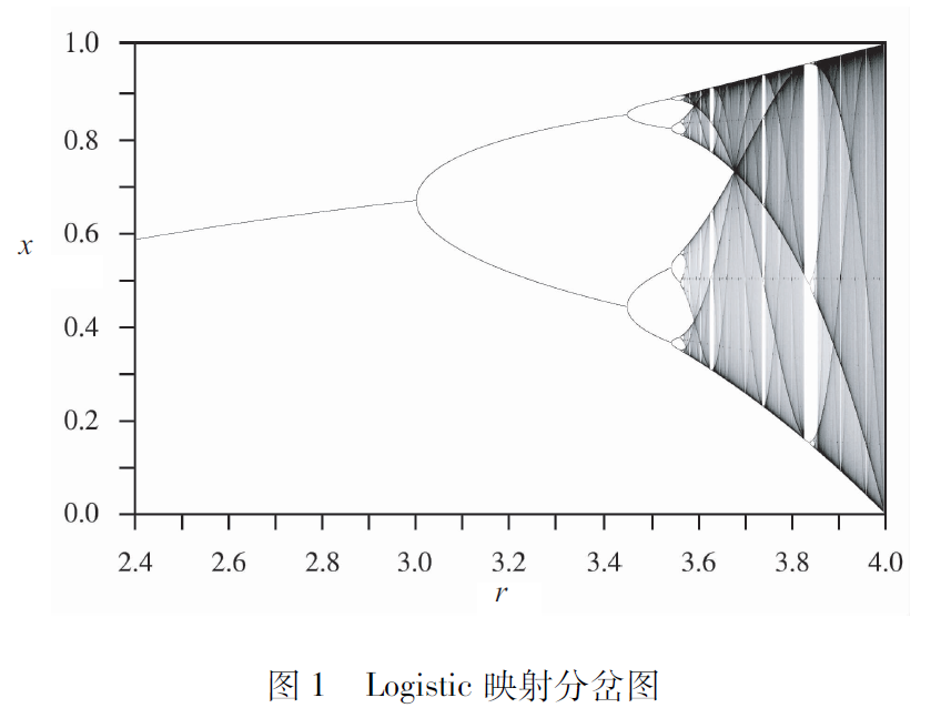 首先給大家介紹一下非線性動力學(xué)的基本概念??紤]到在座的大多是等離子體方面的專家,對非線性動力學(xué)不太熟悉,因此我就從最簡單的離散映射系統(tǒng)開始為大家進(jìn)行介紹。這個映射系統(tǒng)雖然看起來非常簡單,但足以讓大家比較好地理解非線性動力學(xué)的基本概念。Logistic映射數(shù)學(xué)表達(dá)式是xn+1=rxn(1-xn),它是非線性動力學(xué)里非?;A(chǔ)的一個例子。盡管Logistic映射看起來很簡單,但它已經(jīng)是一個動力學(xué)系統(tǒng),即它的狀態(tài)變量是隨時間演化的。對于我們現(xiàn)在討論的Logistic映射,比如說第n步是xn,那第n+1步是什么呢?很簡單,由映射關(guān)系就可以得到xn+1。我們來觀察它隨時間會如何演化,比如說從x0開始,迭代第一步得到x1,再得到x2,一直迭代下去我們最終可以觀察到映射的穩(wěn)態(tài)結(jié)果,那我們究竟可以觀察到什么樣的穩(wěn)態(tài)行為呢?這其實(shí)就是非線性動力學(xué)研究的一個主要內(nèi)容。我們來看這么一個簡單的Logistic映射,圖1給出了它的分岔圖。顯然,映射最終的穩(wěn)態(tài)行為是與映射的參數(shù)有關(guān)系的,通過圖1的分岔圖我們就可以觀察映射在各個參數(shù)下的穩(wěn)態(tài)行為。