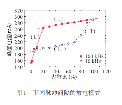如果兩個脈沖間隔比較近,那么跟連續(xù)就沒什么差異,因?yàn)槊}沖撤銷以后,即射頻消失以后,電極間還存在的空間電荷,也就是有電子和離子分離存在,這些電子在第二脈沖上來后就會參與放電,這時與連續(xù)放電差異性就不大了。如果脈沖間隔范圍足夠?qū)挘@就成為兩個不同的放電,兩個放電之間是不相關(guān)的。如圖1( I)是脈沖之間間隔非常小的時候,稱為連續(xù)模式;下面的Ⅲ是脈沖之間間隔非常大的時候,稱為分離模式,我們可以看到整個放電的峰值電流要小不少。在它們之間,(II)稱為傳輸模式,在兩個脈沖之間,電子沒有完全消亡的情況下放電電流與占空比的關(guān)系。共有上述三個過程,可見脈沖的間隔長短對放電的影響不是由占空比決定,主要是考慮電極之間間距和里面所參與的空間電荷分布變化。