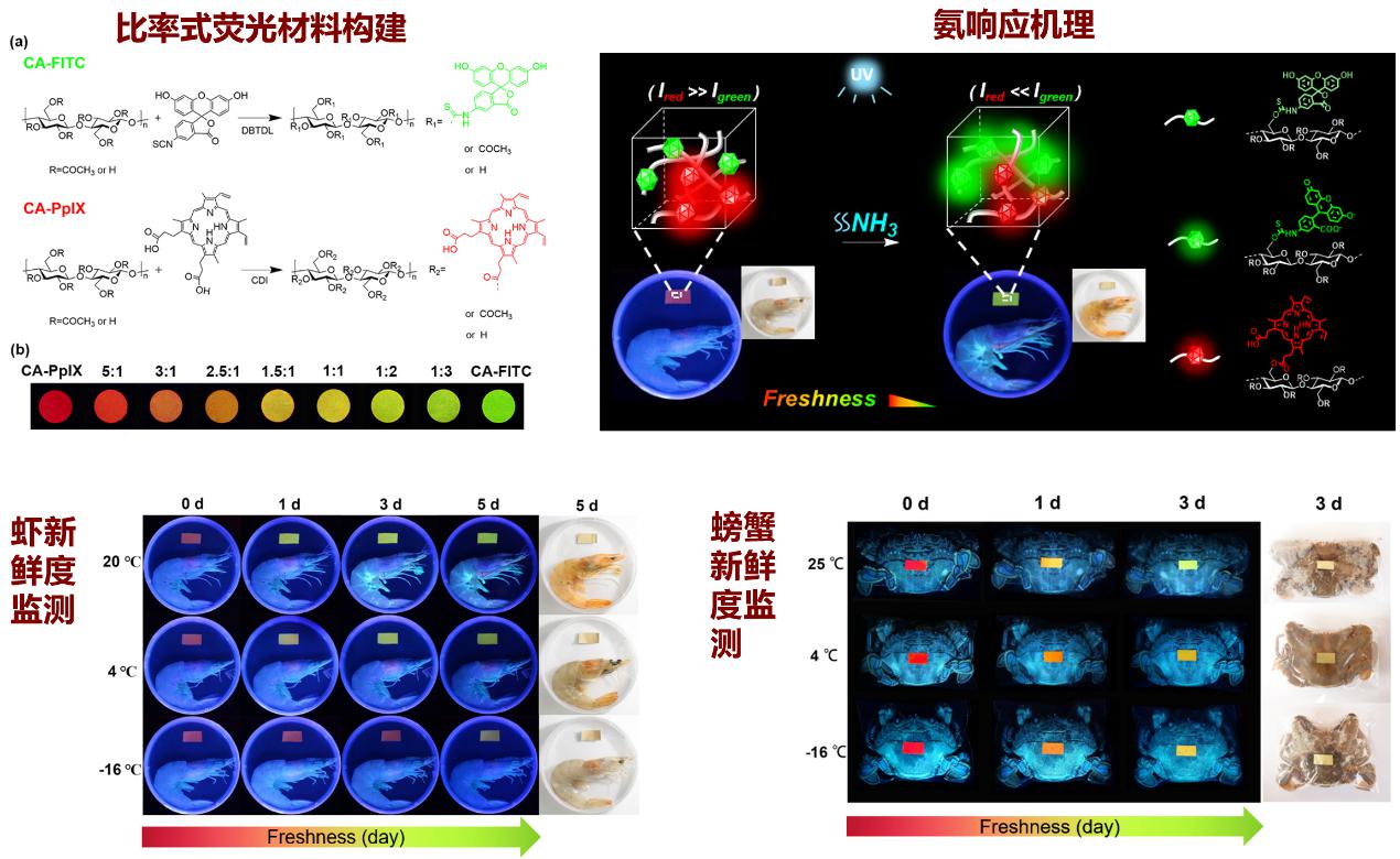 圖6 纖維素基胺響應雙發(fā)射固態(tài)熒光標簽:海鮮新鮮度監(jiān)測